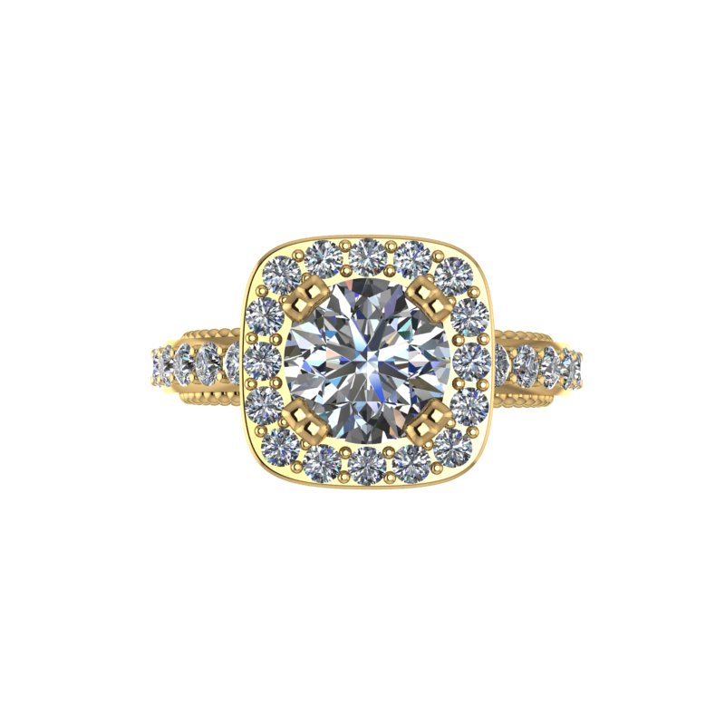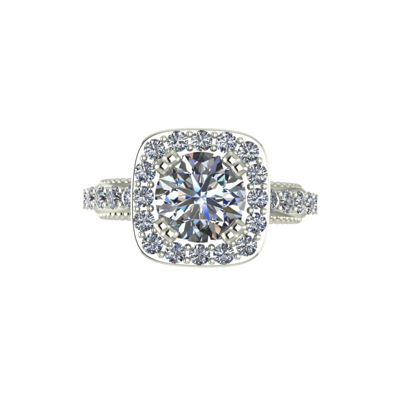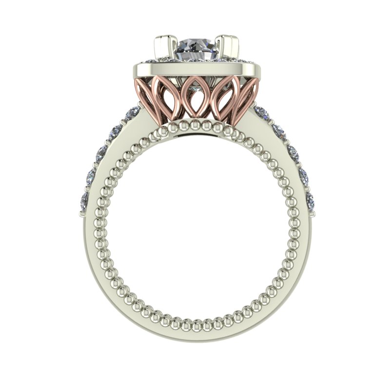 This unique ring was designed with inspiration from classic art deco and art nouveau designs. The beautiful custom cut blue sapphires accent the center stone and bring vivid color into the body of the ring.